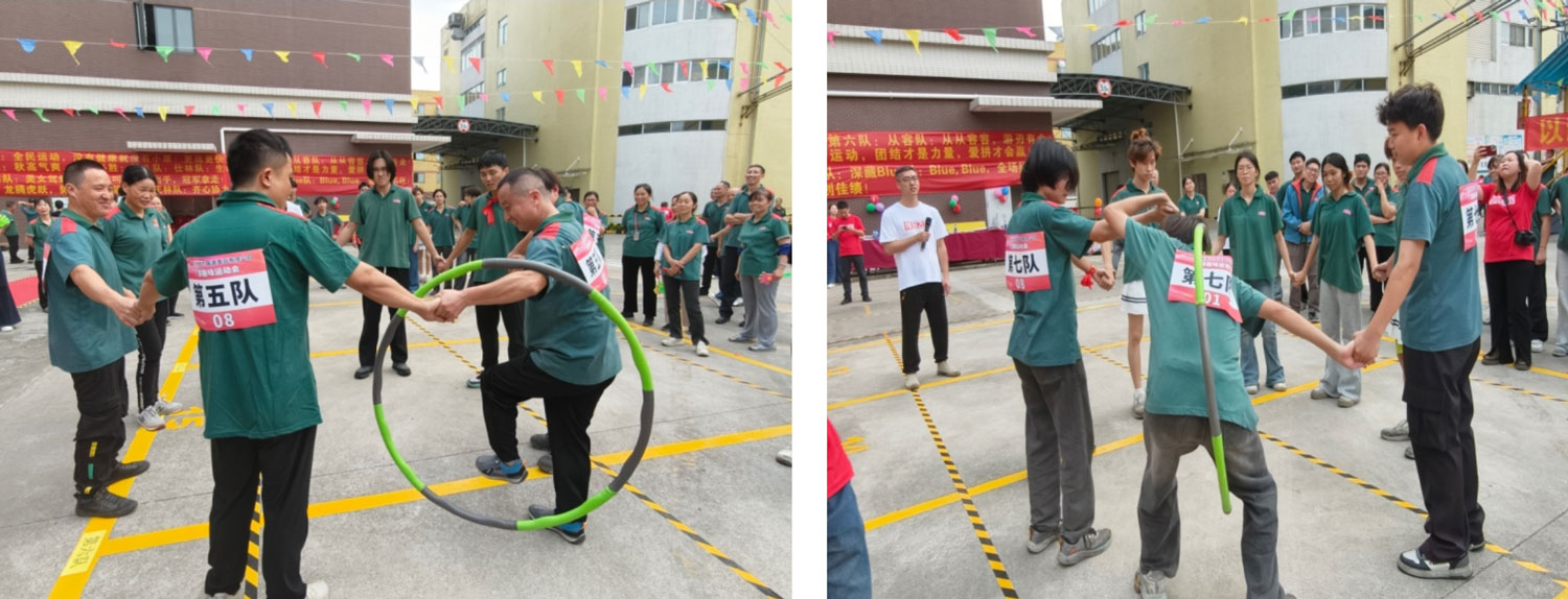 第四個比賽項目——“一圈到底”,隊員們手拉手緊密相連,通過身體的靈活扭動與默契配合傳遞呼啦圈,考驗著團隊的默契配合和身體的柔韌性。隊員們緊密合作,共同完成一項項挑戰(zhàn)。